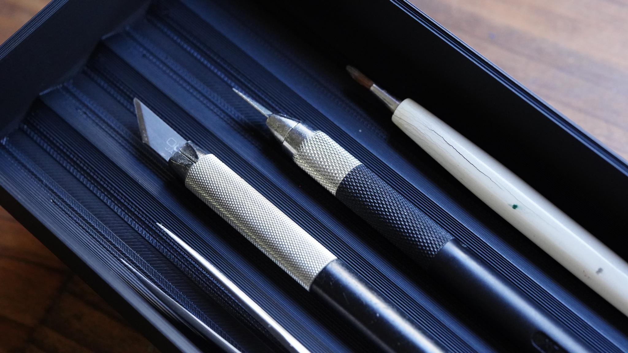 デザインナイフや筆など、細長く転がりやすいツールに、固定位置を与えてくれる本アイテム。